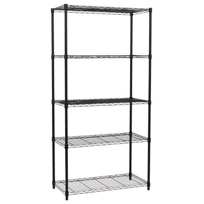 Tool-less assembly. Light gauge wire construction. Black texture powdercoat. Five levels.
