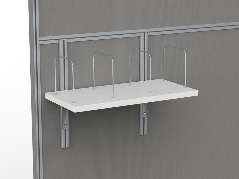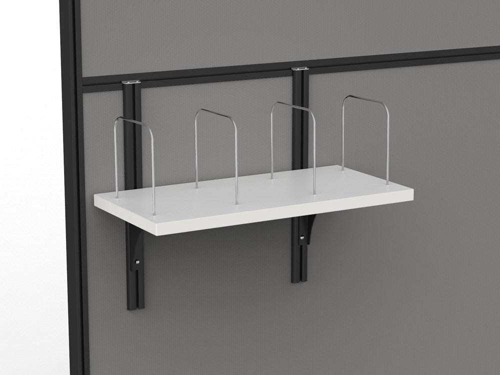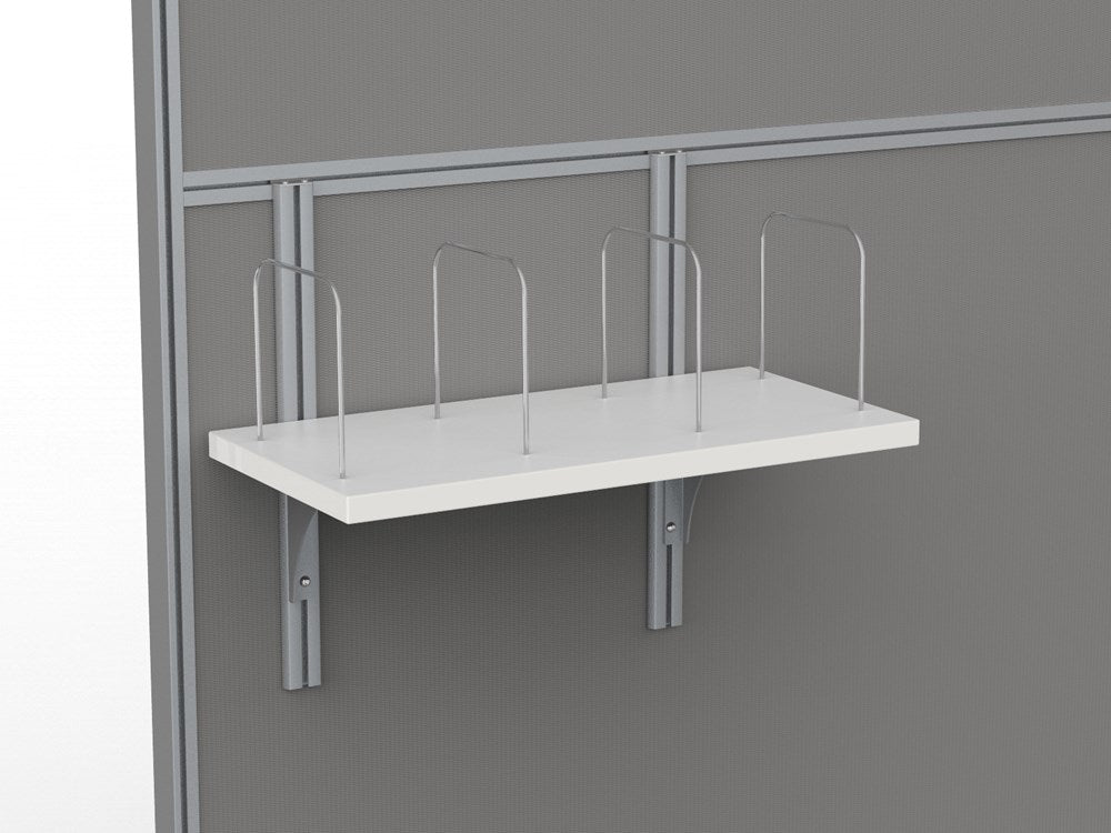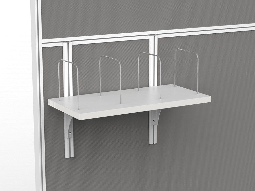 Adjustable shelf for Studio50 screens. 600mm x 290mm white melamine shelf, with black, white nad silver powdercoated brackets.